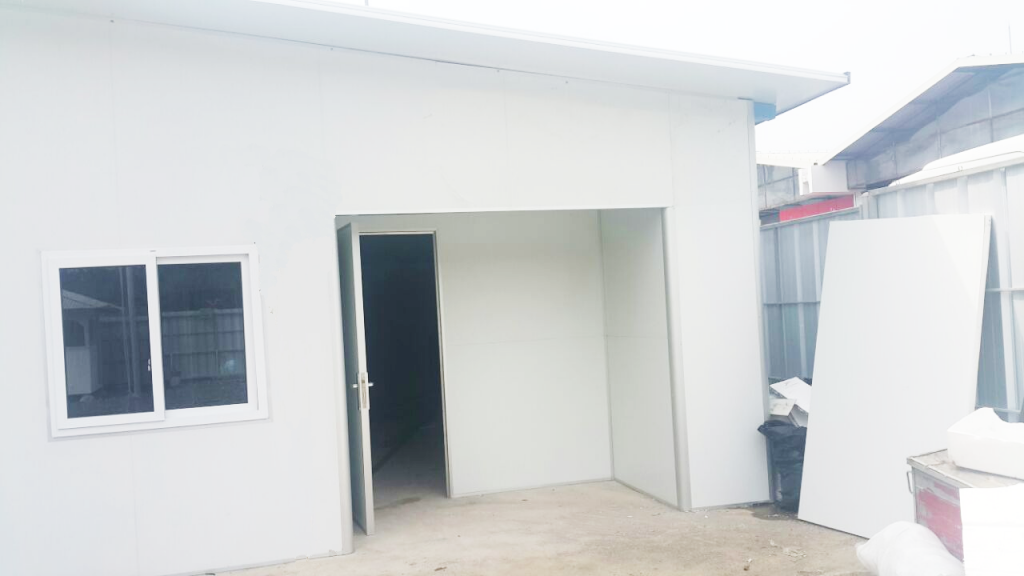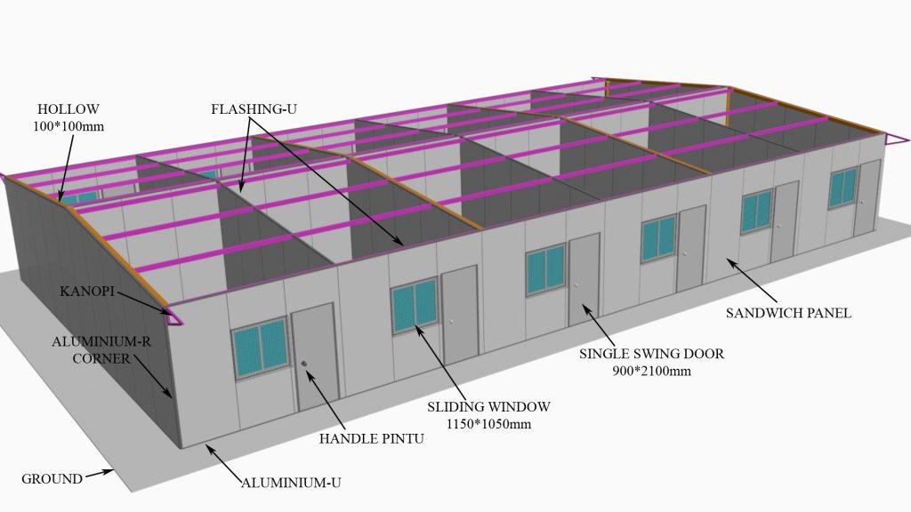 Dengan rangka baja ringan dan material sandwich panel, serta atap insulasi, material ini dapat menahan cuaca dengan baik.